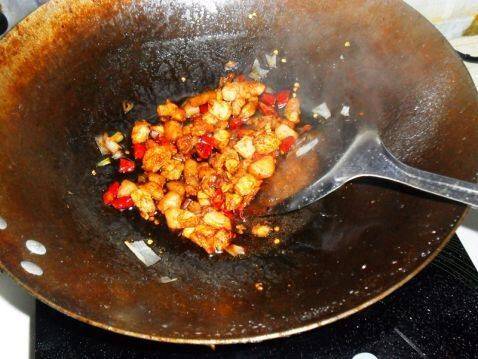 5、锅中放油,倒入猪肉炒至快熟,加入葱、花椒、辣椒煸炒出香味。再加入少许酱油。