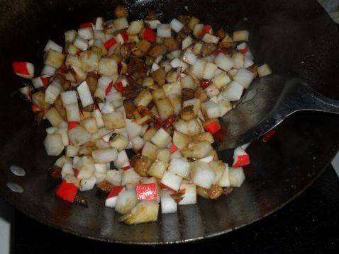 6、放入萝卜丁加盐翻炒片刻,加小半碗水炖一下。