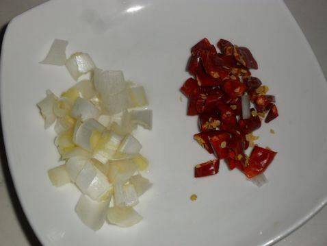 3、葱和红辣椒切好备用。