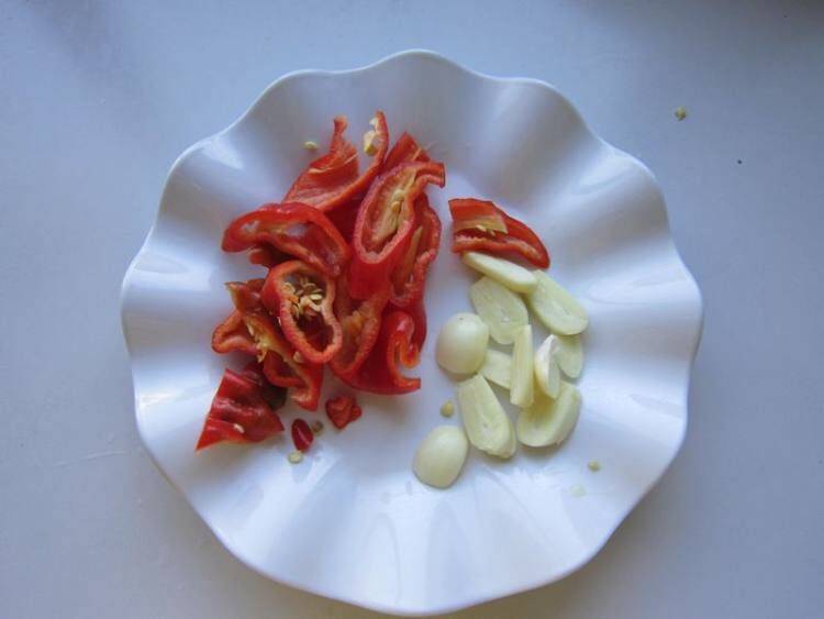 2、把辣皮子泡泡洗净切段,青红辣椒洗净切斜段。
