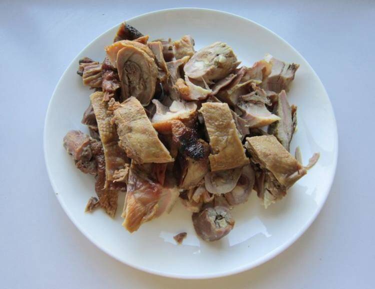 6、下卤鸭翻炒均匀,加少许水再次翻炒3分钟左右。