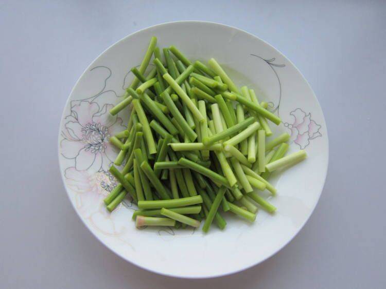 2、把蒜薹去头尾洗净切段,加少许盐拌均匀,腌制入味。