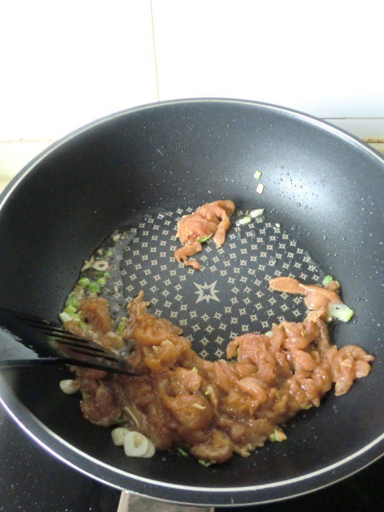 6、倒入鸡肉翻炒至鸡肉变色盛出。