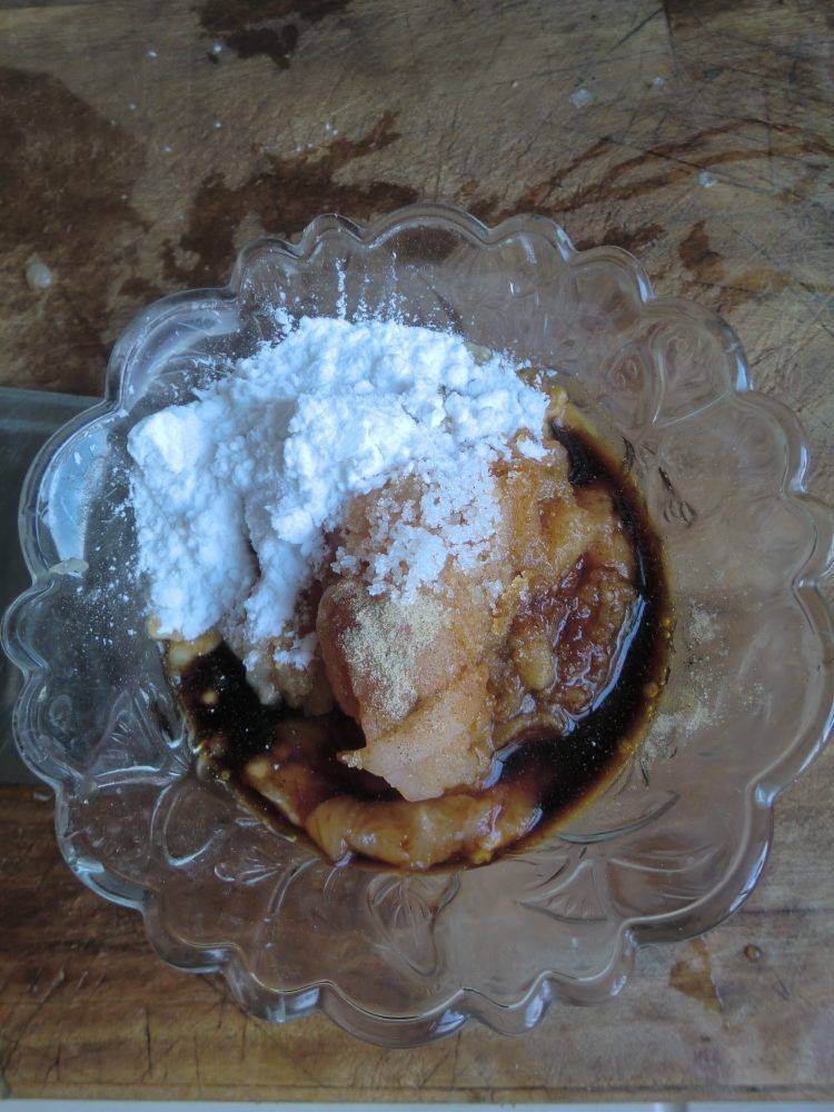 2、鸡肉切丝加入生抽、料酒、白糖、胡椒粉、淀粉抓拌均匀腌制片刻。