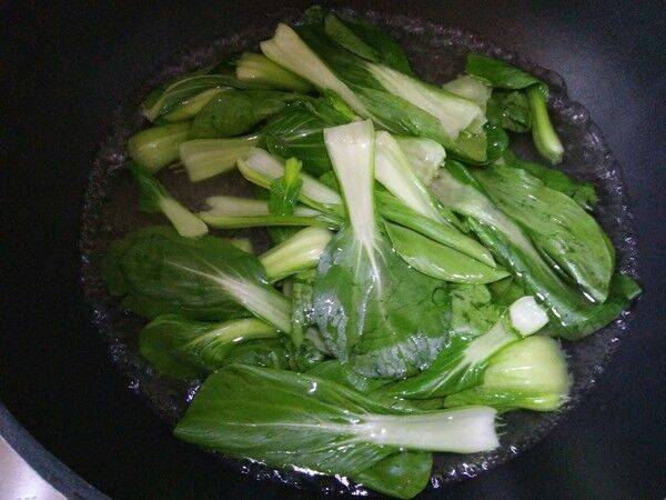 2、锅中水烧开,加少许盐,油菜烫一分钟,捞出过凉水。