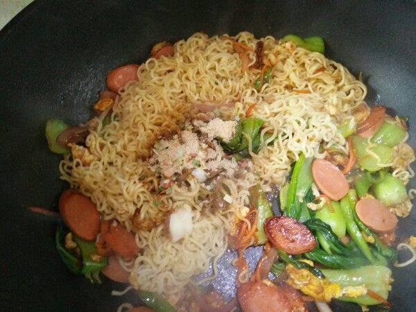 8、放料包,根据个人口味调整用量,炒匀即可。