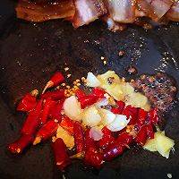 7、将肉片拨到一边,加入干辣椒、姜蒜、花椒粒炒出香味。
