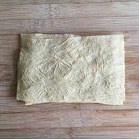 7、将肉末放入油豆皮中间,卷起两端。