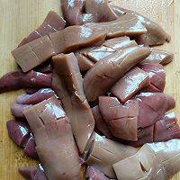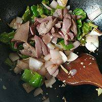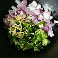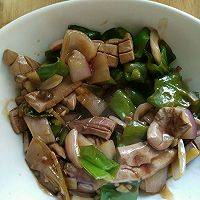 9、热锅冷油,先炒洋葱、姜丝、青椒及蒜泥,待软下来后再放入猪腰。