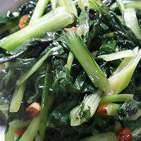 4、锅中加油,把线椒和葱爆香,放入油菜翻炒一下,菜叶炒变色,加入十三香、盐、味达美、香油,炒匀即可出锅。