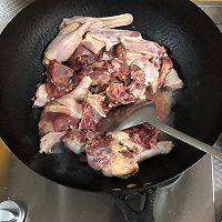 2、将鸭子切块,干锅炒鸭肉,炒干水分。