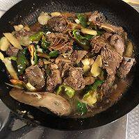 7、倒入鸭肉翻炒,加入青椒、紫苏。