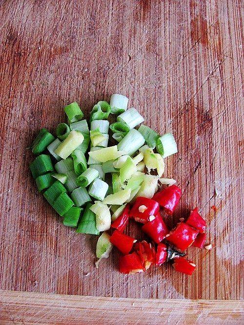 3、葱姜辣椒切碎。