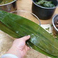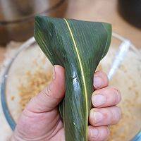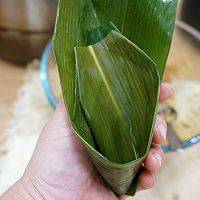 8、将叶子往下折,完全盖住米粒,并用手捏成倒着的等腰三角形,并用绳子绑好。