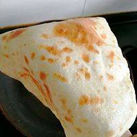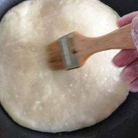 8、锅烧热,锅热后改小火,放入饼,鼓泡刷油后翻面,另一面也刷油。