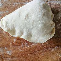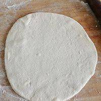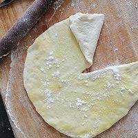 4、擀圆面团,中间切一刀,抹油,撒盐,撒些干面粉,卷起。