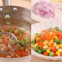 4、锅里倒入适量清水,烧开后把胡萝卜丁、玉米粒和青豆焯一下水,捞出沥干水分。
