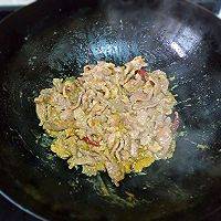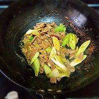 6、羊肉快速炒熟后放入葱段,再倒入准备好的调料汁。