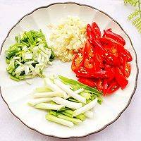 3、小葱切断,青红椒斜刀切,大蒜切丁放入盘中备用。