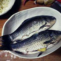 2、鲫鱼清洗干净,倒入料酒、胡椒粉、盐、姜片,腌制20~30分钟,腌好后去掉姜片,用清水再洗一遍。