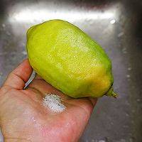 2、用盐揉搓柠檬皮表面,然后用清水冲洗干净,再用热水迅速淋烫一下,洗干净整个柠檬。