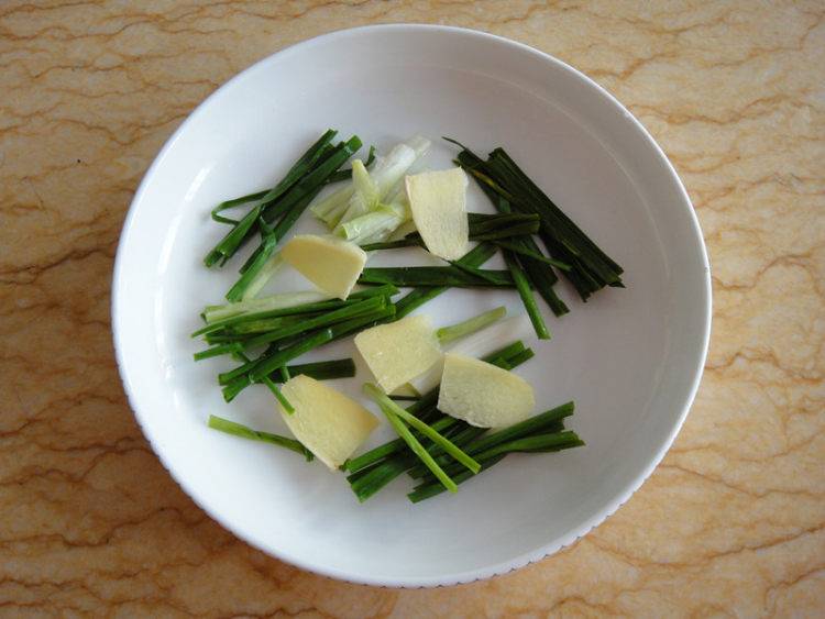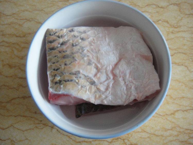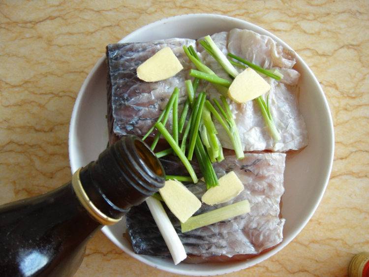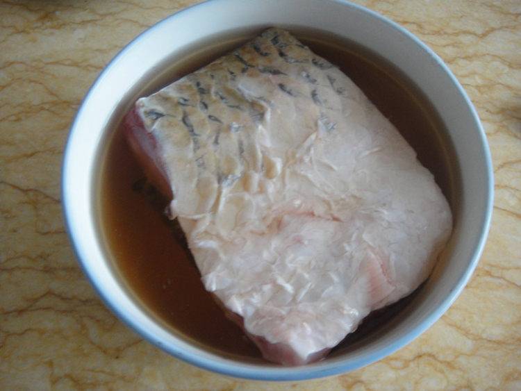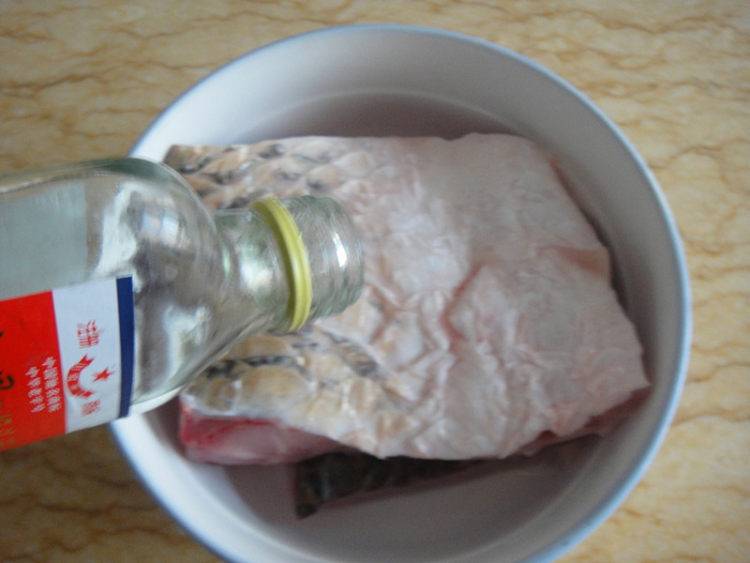 9、晾干的鱼块用温水洗净,加入盆中,再加入葱段、姜片和料酒。