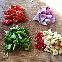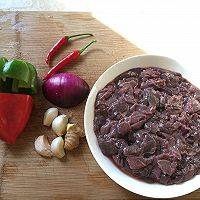 1、准备材料:猪肝600克、盐3克、糖2克、生粉15克、生抽40克、啤酒40毫升、青红彩椒各半个、朝天椒1个、蒜4瓣、姜1块、洋葱小半个。