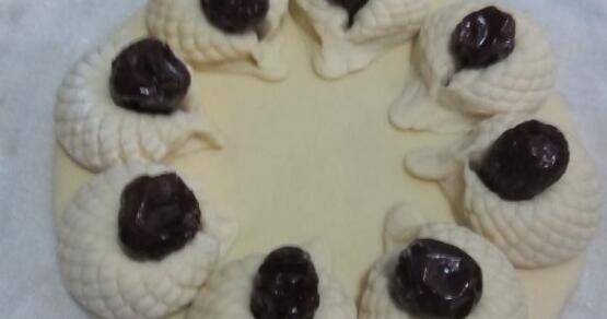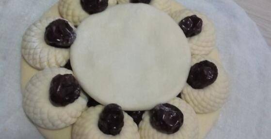 7、中间空余处塞满小枣,取小点的面团排气后轧成圆片儿,大小和中间空余处一致,盖在中间部位,形成第二层托盘。