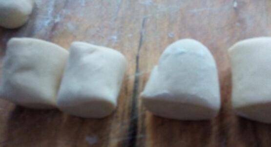 3、再取一块面,轻揉排气后搓成黄瓜粗细的长条,切成大小相当的面块。