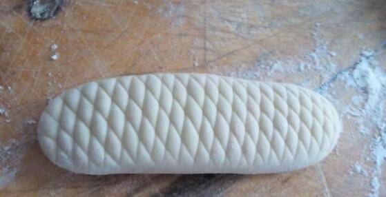 4、取一个面块,揉成光滑的长条,按扁后斜刀切出条纹,不用切断,能出纹路即可,反向再切出同样的条纹,就可以形成鱼鳞状的形状。