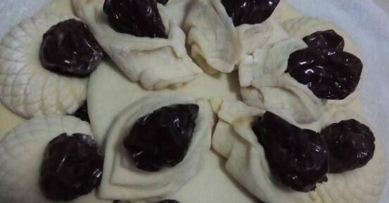8、取更小的面团排气后轧成小圆片,从中间切十字花刀,两刀都切断。取三片如图顺次摆列在一起,拿一颗大枣放在中部,用后面的面皮包裹大枣捏成另一种花糕鼻子,把做好的花糕鼻子顺次排列在第二层的面托上。