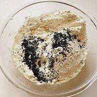 2、鸡蛋、水、盐搅拌融合后加入面粉、黑芝麻。