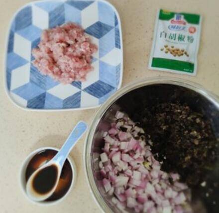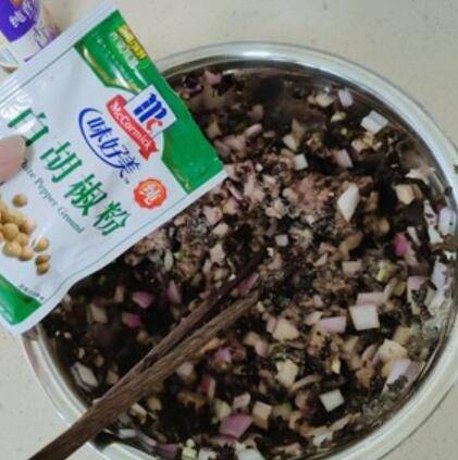 5、将瘦肉、洋葱、木耳、葱花、蒜蓉、酱油混合搅匀,放入适量胡椒粉搅匀。
