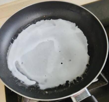 9、平底锅保持小火加热,刷一层油,倒入2大汤勺粉浆,晃开成粉皮,等粉皮几乎变透明后,关火。