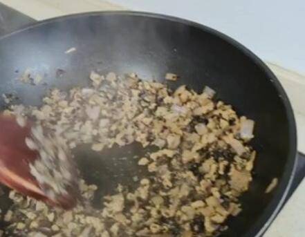6、热锅倒油,将馅料炒熟,翻炒至几乎无汤汁。盛出备用。