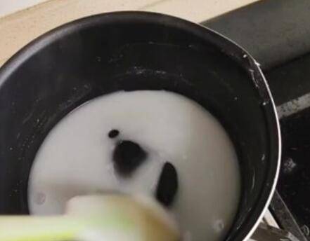 2、舀1大汤勺粉浆到小锅中,再倒入半碗水。小火加热做熟浆,一直搅拌,计时显示我从开火到成熟浆,大约一分钟。
