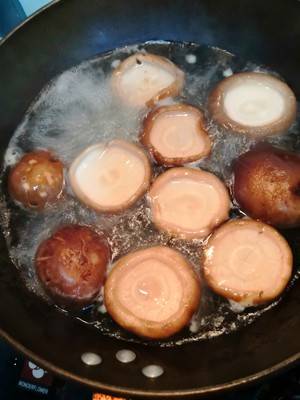 8、将调好的酱汁倒入锅中煮开,放入切好的香菇,用中火焖煮约2-3分钟!