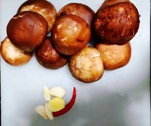 1、准备用料:香菇10朵、大蒜3瓣、生姜5片、小米椒1个、生抽3勺、蚝油1/3勺、老抽适量、盐适量、糖半勺、清水200克、十三香少量、水淀粉少量。