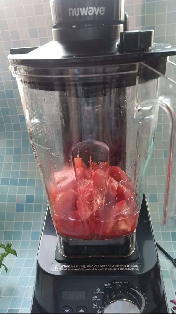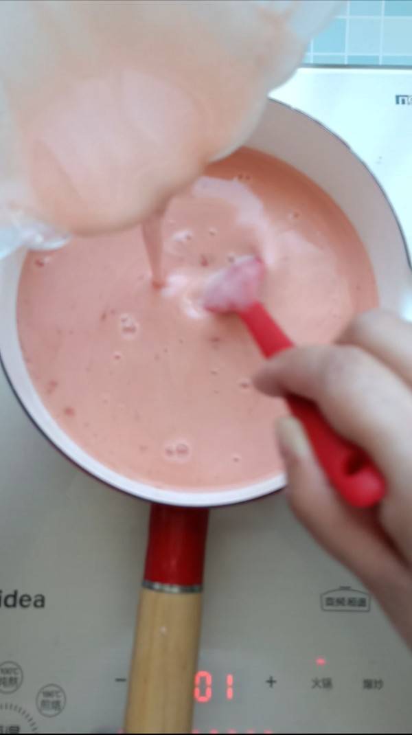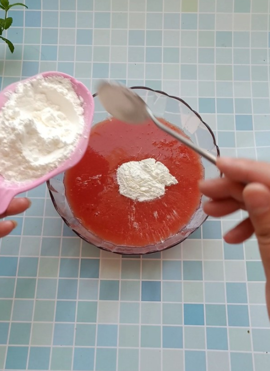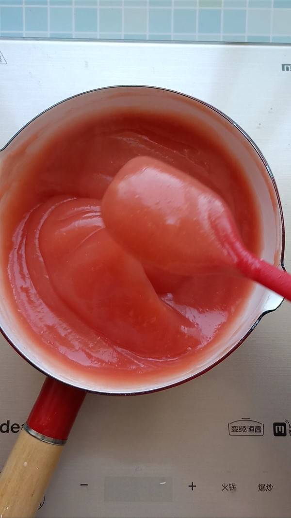 4、将豌豆粉放入西红柿汁里搅拌均匀至无颗粒状态。