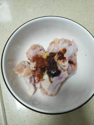 3、切小的小鸡腿放碗里,加入适量的盐、料酒、蚝油、生抽、姜片、老干妈。