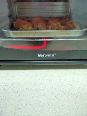 6、刷好油的鸡腿放入烤箱,温度200度烤30分钟,途中给小鸡腿翻一下面。