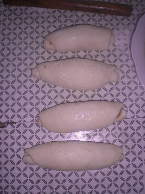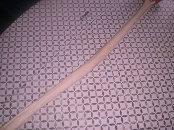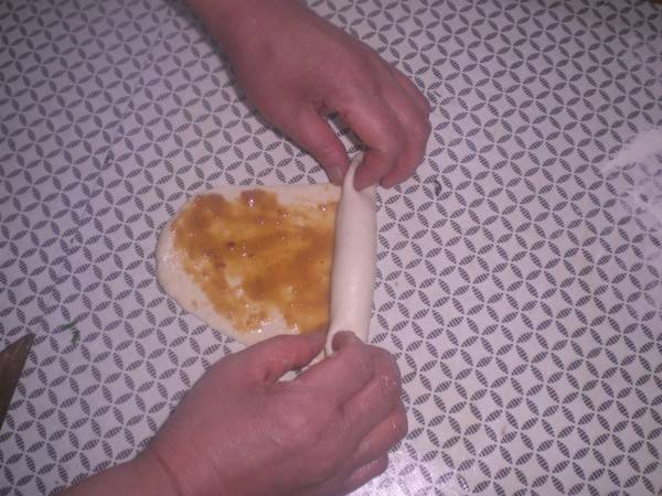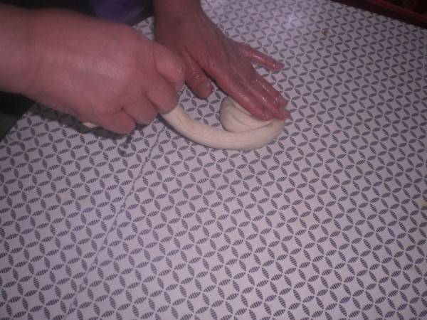 10、醒好后,将卷好的坯子搓成长条状,边搓边尽量拉长。