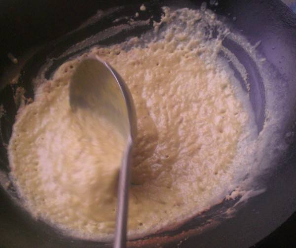 4、炒到面粉变色即关火,勺子不要停,要一直搅拌。
