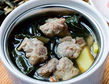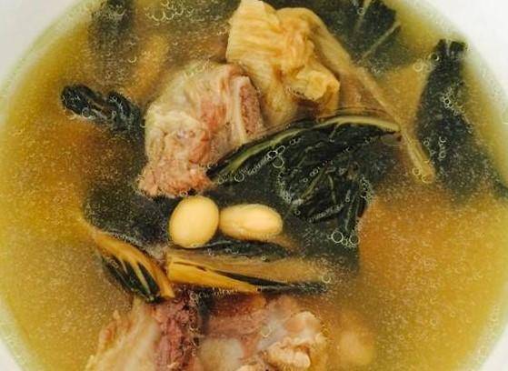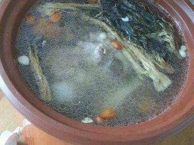 2、菜干猪骨汤:菜干预先泡上1~2个小时,然后切成小段,锅中倒入清水、猪骨、蜜枣、姜片,大火烧开,转成小火慢煲一个半小时即可。