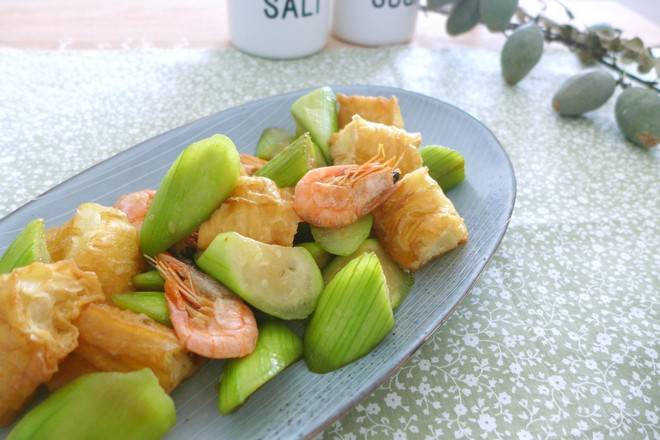 5、丝瓜炒油条:将丝瓜洗净,去皮,切成滚刀块,油条切成寸段,锅中加入少许食用油,放入姜片、北极虾,煸炒出香味,放入丝瓜,翻炒2分钟,加入适量盐,继续翻炒,待丝瓜8成熟时,放入油条,翻炒均匀即可。