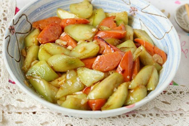 2、丝瓜炒香肠:丝瓜去皮切成块,香肠切块,蒜切末,炒锅烧热,加入少许调和油,烧热后再下入一半的蒜末,爆出香味,倒入丝瓜和香肠翻炒,丝瓜变软后,加入一勺蚝油调味,翻炒均匀入味后,关火,加入剩下的一半蒜末,利用余温把蒜末炒熟即可。