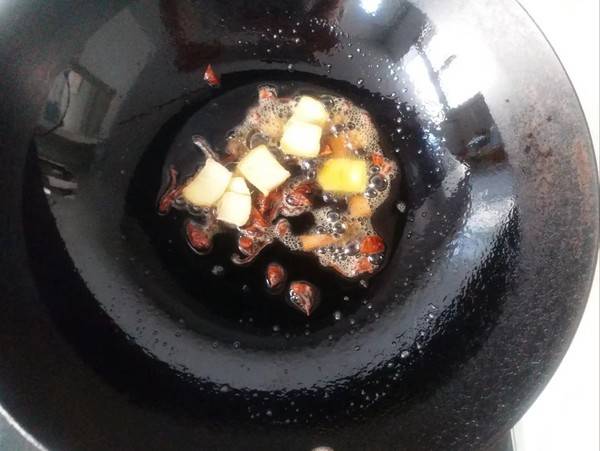 3、锅内倒入适量油,开大火烧热后,转小火,放入花椒、八角、桂皮、生姜片炸香。