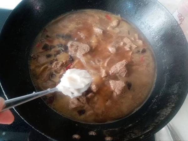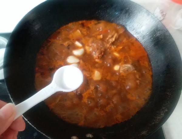 10、焖煮至锅内汤汁还剩三分之一时,放入一勺盐再次焖煮。