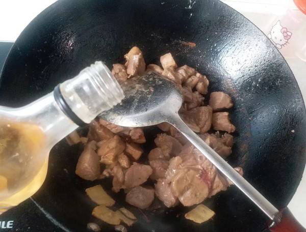 5、将猪肉水分炒干后,倒入一勺料酒翻炒均匀。