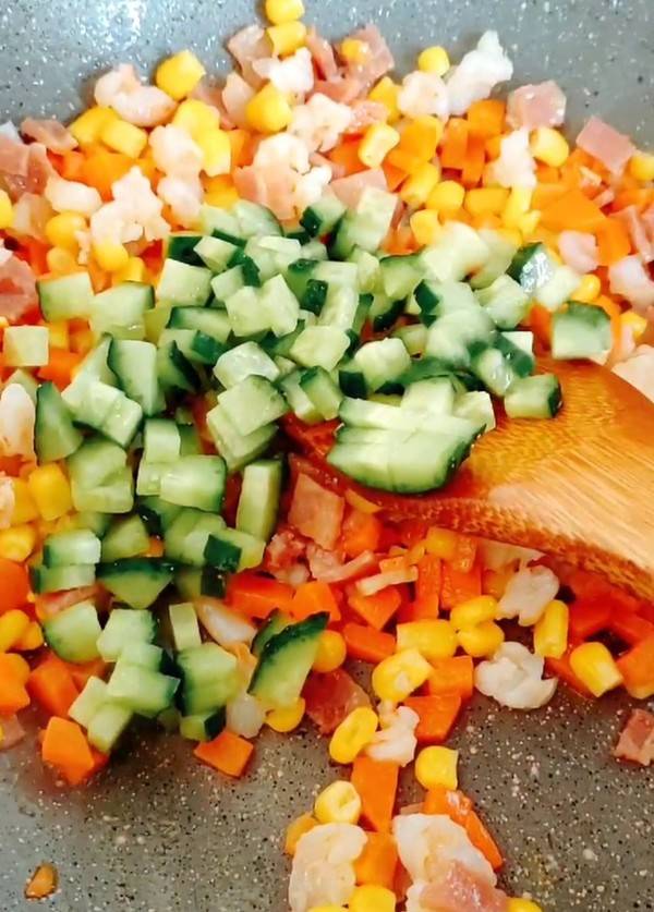 6、再倒入胡萝卜、玉米粒、虾仁粒、黄瓜粒。